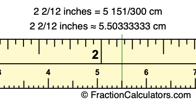 One inch is equal to 127/50 centimeters. Therefore, to get the fractional answer to 2 2/12 inches to cm, we multiply 2 2/12 inches by 127/50 and simplify if necessary.