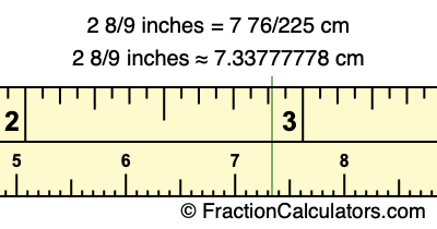 One inch is equal to 127/50 centimeters. Therefore, to get the fractional answer to 2 8/9 inches to cm, we multiply 2 8/9 inches by 127/50 and simplify if necessary.