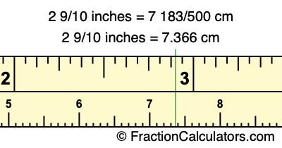 Centimeters is usually given in decimal form, so we have also converted the fractional answer to 2 9/10 inches to cm, to decimal form: