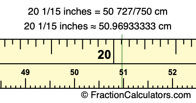 One inch is equal to 127/50 centimeters. Therefore, to get the fractional answer to 20 1/15 inches to cm, we multiply 20 1/15 inches by 127/50 and simplify if necessary.