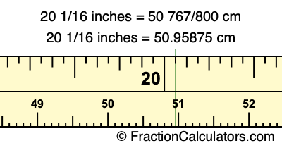 Centimeters is usually given in decimal form, so we have also converted the fractional answer to 20 1/16 inches to cm, to decimal form: