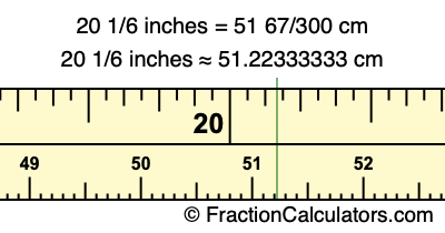 One inch is equal to 127/50 centimeters. Therefore, to get the fractional answer to 20 1/6 inches to cm, we multiply 20 1/6 inches by 127/50 and simplify if necessary.