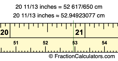 Centimeters is usually given in decimal form, so we have also converted the fractional answer to 20 11/13 inches to cm, to decimal form: