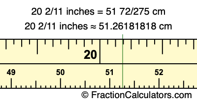 One inch is equal to 127/50 centimeters. Therefore, to get the fractional answer to 20 2/11 inches to cm, we multiply 20 2/11 inches by 127/50 and simplify if necessary.