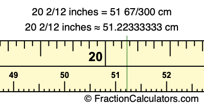 One inch is equal to 127/50 centimeters. Therefore, to get the fractional answer to 20 2/12 inches to cm, we multiply 20 2/12 inches by 127/50 and simplify if necessary.