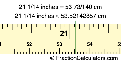 One inch is equal to 127/50 centimeters. Therefore, to get the fractional answer to 21 1/14 inches to cm, we multiply 21 1/14 inches by 127/50 and simplify if necessary.