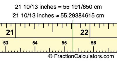 Centimeters is usually given in decimal form, so we have also converted the fractional answer to 21 10/13 inches to cm, to decimal form: