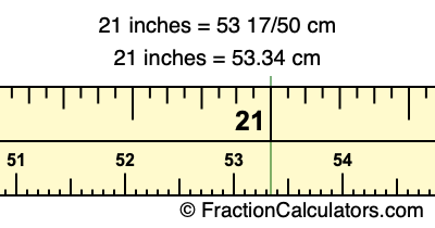 One inch is equal to 127/50 centimeters. Therefore, to get the fractional answer to 21 inches to cm, we multiply 21 inches by 127/50 and simplify if necessary.