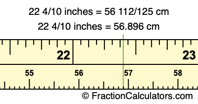 Centimeters is usually given in decimal form, so we have also converted the fractional answer to 22 4/10 inches to cm, to decimal form: