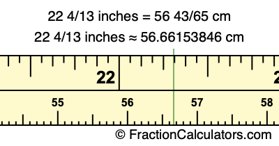 Centimeters is usually given in decimal form, so we have also converted the fractional answer to 22 4/13 inches to cm, to decimal form: