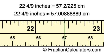 Centimeters is usually given in decimal form, so we have also converted the fractional answer to 22 4/9 inches to cm, to decimal form: