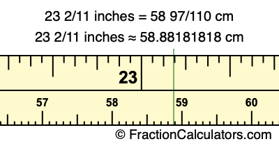 One inch is equal to 127/50 centimeters. Therefore, to get the fractional answer to 23 2/11 inches to cm, we multiply 23 2/11 inches by 127/50 and simplify if necessary.