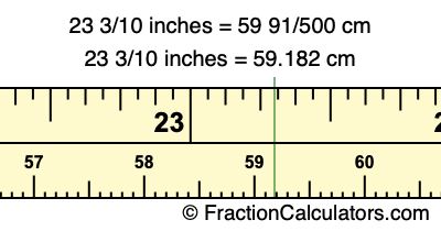 Centimeters is usually given in decimal form, so we have also converted the fractional answer to 23 3/10 inches to cm, to decimal form: