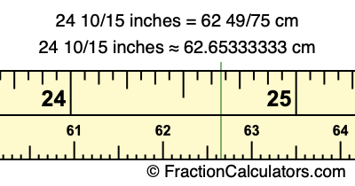 Centimeters is usually given in decimal form, so we have also converted the fractional answer to 24 10/15 inches to cm, to decimal form: