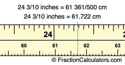Centimeters is usually given in decimal form, so we have also converted the fractional answer to 24 3/10 inches to cm, to decimal form: