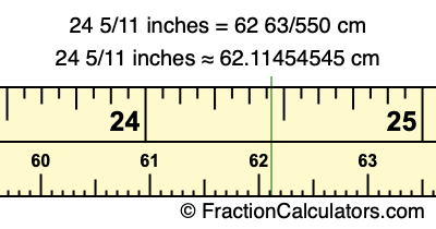 One inch is equal to 127/50 centimeters. Therefore, to get the fractional answer to 24 5/11 inches to cm, we multiply 24 5/11 inches by 127/50 and simplify if necessary.