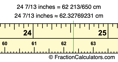 Centimeters is usually given in decimal form, so we have also converted the fractional answer to 24 7/13 inches to cm, to decimal form: