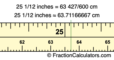 One inch is equal to 127/50 centimeters. Therefore, to get the fractional answer to 25 1/12 inches to cm, we multiply 25 1/12 inches by 127/50 and simplify if necessary.