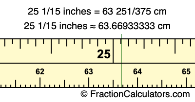 One inch is equal to 127/50 centimeters. Therefore, to get the fractional answer to 25 1/15 inches to cm, we multiply 25 1/15 inches by 127/50 and simplify if necessary.