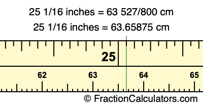 Centimeters is usually given in decimal form, so we have also converted the fractional answer to 25 1/16 inches to cm, to decimal form: