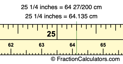 Centimeters is usually given in decimal form, so we have also converted the fractional answer to 25 1/4 inches to cm, to decimal form: