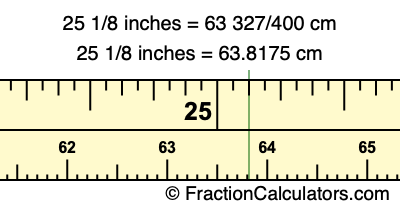 Centimeters is usually given in decimal form, so we have also converted the fractional answer to 25 1/8 inches to cm, to decimal form: