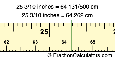 Centimeters is usually given in decimal form, so we have also converted the fractional answer to 25 3/10 inches to cm, to decimal form: