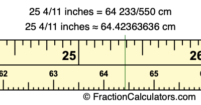 One inch is equal to 127/50 centimeters. Therefore, to get the fractional answer to 25 4/11 inches to cm, we multiply 25 4/11 inches by 127/50 and simplify if necessary.