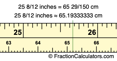 Centimeters is usually given in decimal form, so we have also converted the fractional answer to 25 8/12 inches to cm, to decimal form: