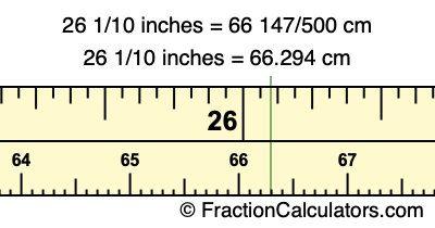 Centimeters is usually given in decimal form, so we have also converted the fractional answer to 26 1/10 inches to cm, to decimal form: