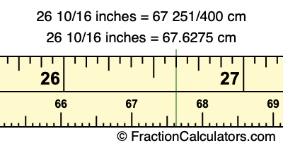 Centimeters is usually given in decimal form, so we have also converted the fractional answer to 26 10/16 inches to cm, to decimal form: