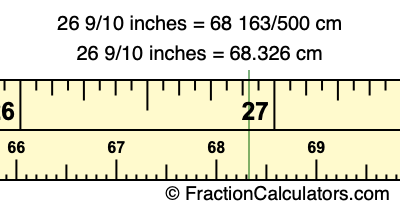 One inch is equal to 127/50 centimeters. Therefore, to get the fractional answer to 26 9/10 inches to cm, we multiply 26 9/10 inches by 127/50 and simplify if necessary.