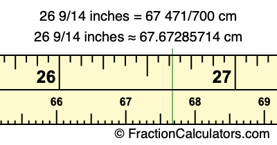 Centimeters is usually given in decimal form, so we have also converted the fractional answer to 26 9/14 inches to cm, to decimal form: