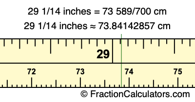 One inch is equal to 127/50 centimeters. Therefore, to get the fractional answer to 29 1/14 inches to cm, we multiply 29 1/14 inches by 127/50 and simplify if necessary.