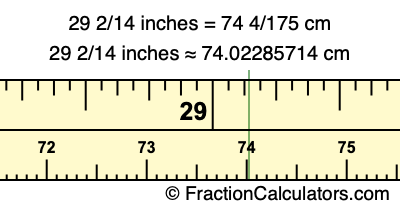 Centimeters is usually given in decimal form, so we have also converted the fractional answer to 29 2/14 inches to cm, to decimal form: