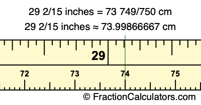 Centimeters is usually given in decimal form, so we have also converted the fractional answer to 29 2/15 inches to cm, to decimal form: