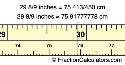 One inch is equal to 127/50 centimeters. Therefore, to get the fractional answer to 29 8/9 inches to cm, we multiply 29 8/9 inches by 127/50 and simplify if necessary.