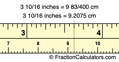 Centimeters is usually given in decimal form, so we have also converted the fractional answer to 3 10/16 inches to cm, to decimal form: