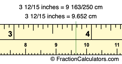 Centimeters is usually given in decimal form, so we have also converted the fractional answer to 3 12/15 inches to cm, to decimal form:
