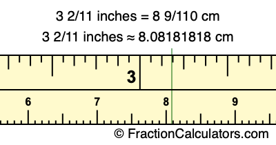 Centimeters is usually given in decimal form, so we have also converted the fractional answer to 3 2/11 inches to cm, to decimal form: