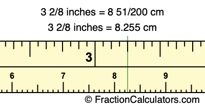 One inch is equal to 127/50 centimeters. Therefore, to get the fractional answer to 3 2/8 inches to cm, we multiply 3 2/8 inches by 127/50 and simplify if necessary.