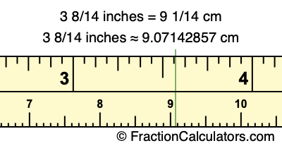 Centimeters is usually given in decimal form, so we have also converted the fractional answer to 3 8/14 inches to cm, to decimal form: