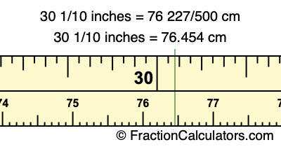 Centimeters is usually given in decimal form, so we have also converted the fractional answer to 30 1/10 inches to cm, to decimal form: