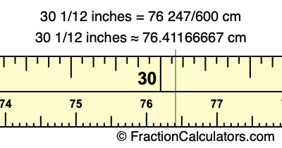 Centimeters is usually given in decimal form, so we have also converted the fractional answer to 30 1/12 inches to cm, to decimal form: