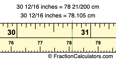 Centimeters is usually given in decimal form, so we have also converted the fractional answer to 30 12/16 inches to cm, to decimal form: