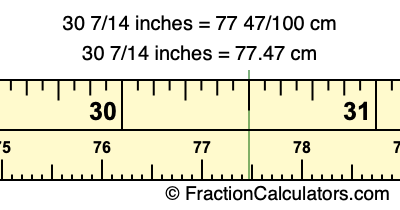Centimeters is usually given in decimal form, so we have also converted the fractional answer to 30 7/14 inches to cm, to decimal form:
