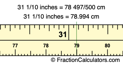 One inch is equal to 127/50 centimeters. Therefore, to get the fractional answer to 31 1/10 inches to cm, we multiply 31 1/10 inches by 127/50 and simplify if necessary.