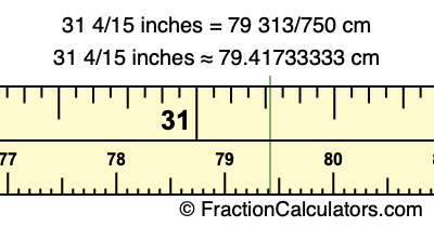 One inch is equal to 127/50 centimeters. Therefore, to get the fractional answer to 31 4/15 inches to cm, we multiply 31 4/15 inches by 127/50 and simplify if necessary.