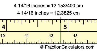 One inch is equal to 127/50 centimeters. Therefore, to get the fractional answer to 4 14/16 inches to cm, we multiply 4 14/16 inches by 127/50 and simplify if necessary.