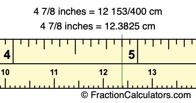 Centimeters is usually given in decimal form, so we have also converted the fractional answer to 4 7/8 inches to cm, to decimal form:
